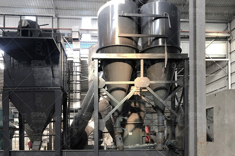 原料經變頻皮帶給料機均勻定量連續地送入主機磨室內進行研磨。粉磨后的物料被風機氣流送入選粉機進行分級,在分析機的作用下,不符合細度要求的物料落入磨室內重新碾磨,合格的物料則隨氣流經管道進入旋風集粉器內,進行分離收集,經排料裝置排出即為成品粉體。分離后的氣流通過旋風集粉器上端回風管進入風機。該生產系統在負壓密閉條件下運行,并配有脈沖除塵器無粉塵外溢,符合國家環保標準。